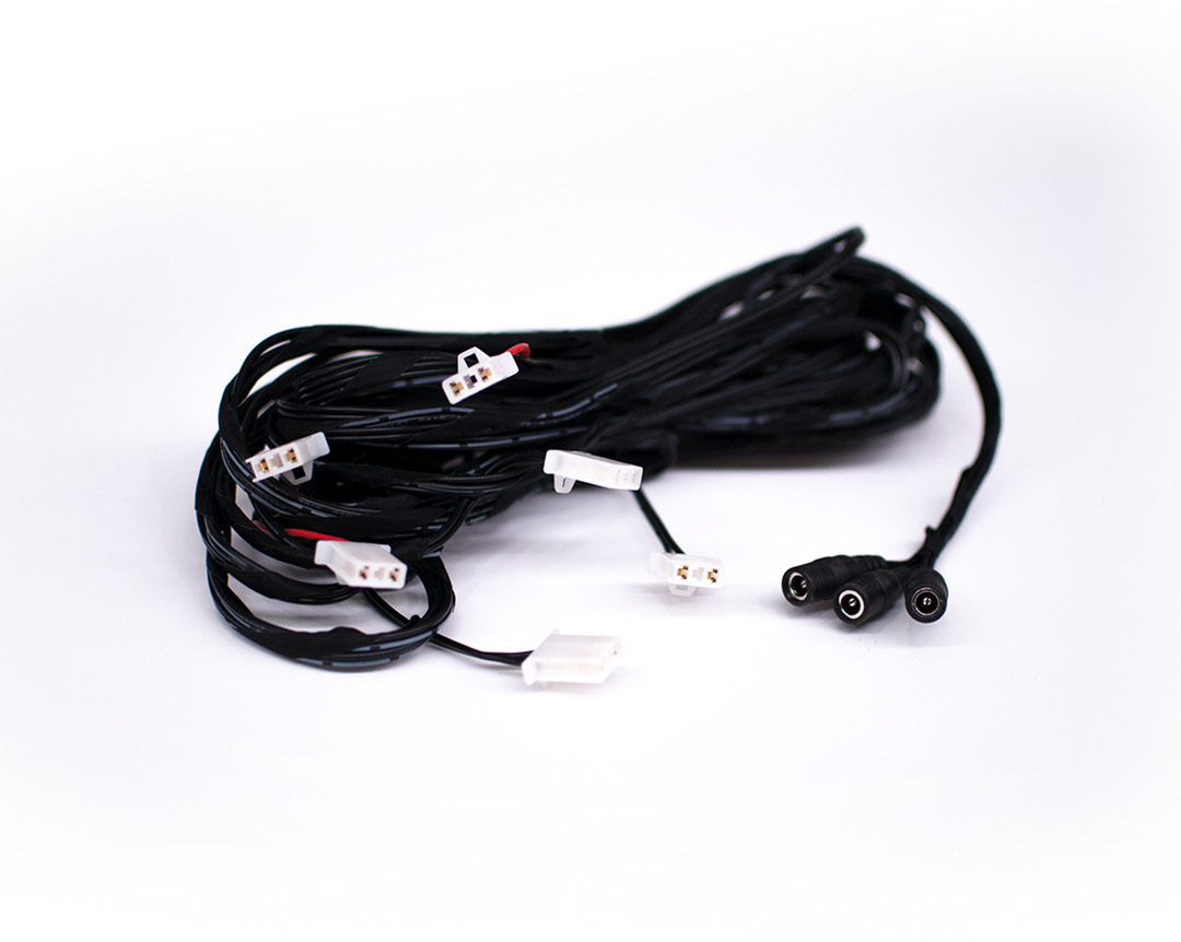 Wiring harness for use with REXframe edge lighting units. Can power either x30 5-light modules or x18 9-light modules.